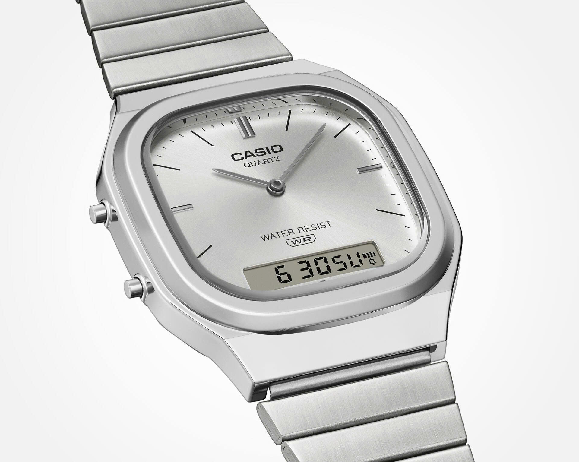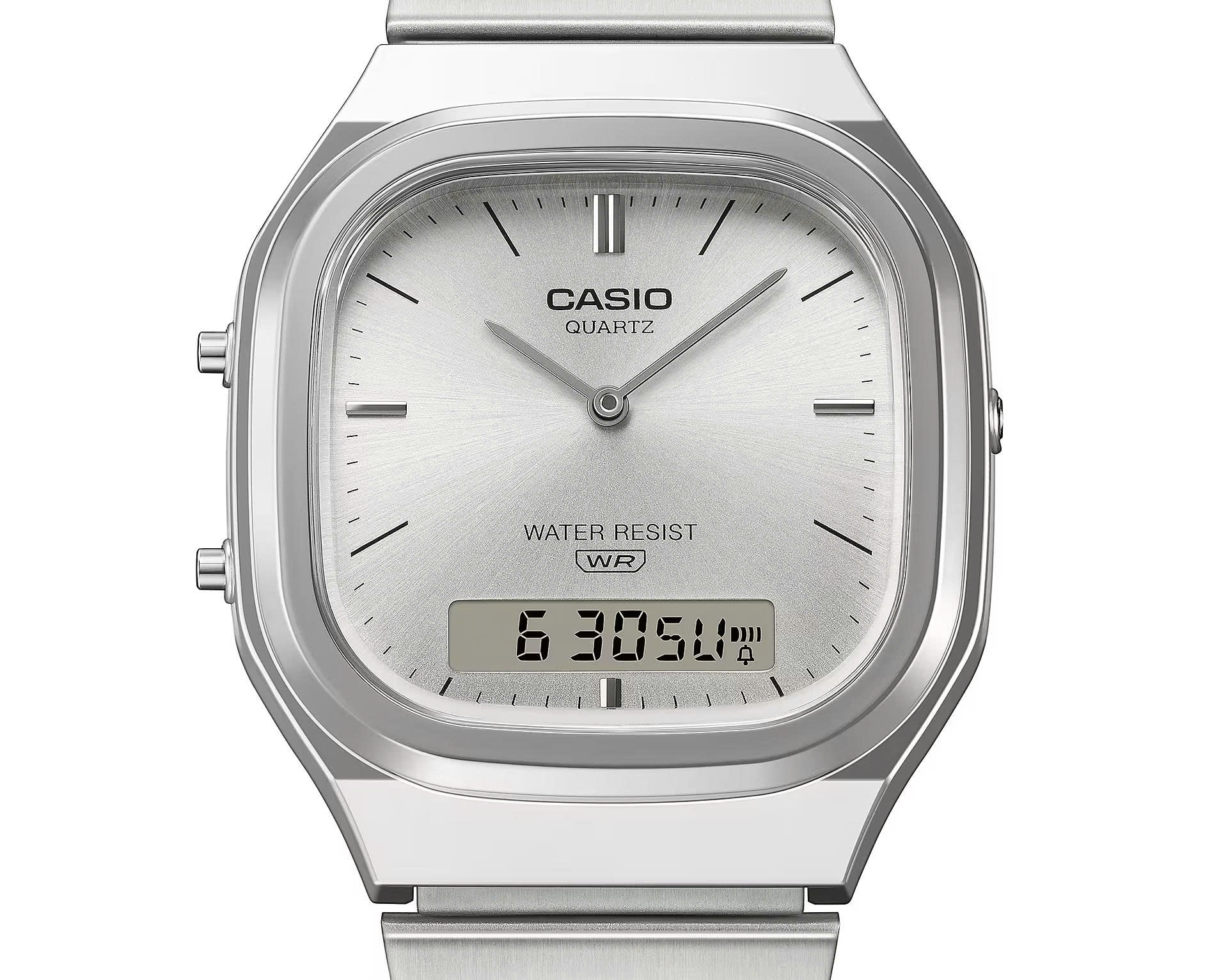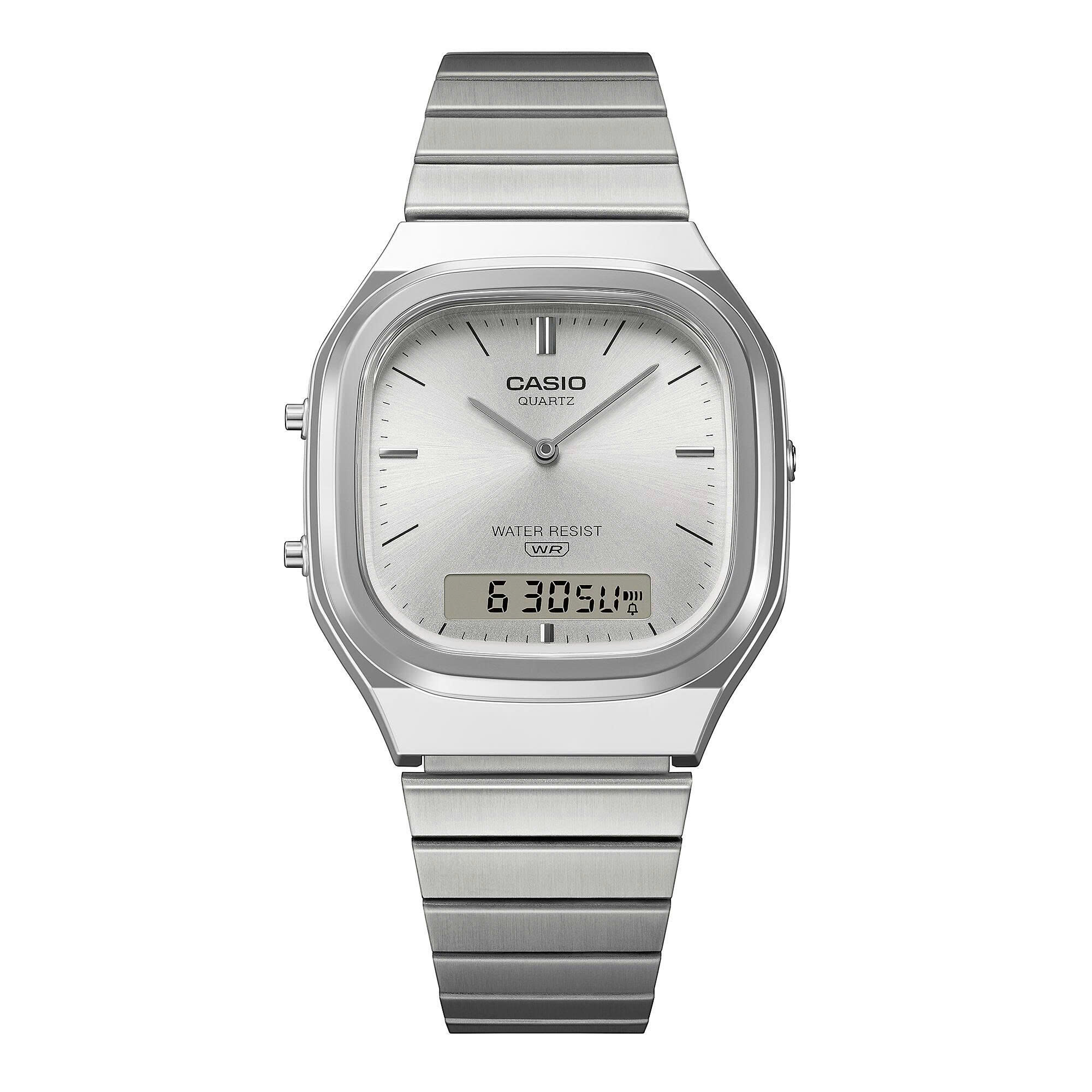 Hãy thổi hồn hiện đại vào phong cách retro của bạn, hoặc điểm xuyết nét cổ điển cho phong cách đương đại của bạn. Dù bạn chọn phong cách nào, chiếc AQ-240E tinh tế và uyển chuyển đều sẽ là lựa chọn hoàn hảo. Chiếc AQ-240 kim-số với màn hình kép mang phong cách cổ điển pha lẫn hiện đại. Với mặt đồng hồ hơi vuông vức, vỏ máy bo tròn nhẹ nhàng và những đường cong kim loại mềm mại, chiếc đồng hồ này toát lên vẻ tinh tế. Lớp hoàn thiện theo thiết kế tia nắng trên mặt số bắt sáng rực rỡ. Các vạch chỉ giờ kim loại kết hợp giữa nét cổ điển và vẻ đẹp hiện đại, tạo thêm điểm nhấn bắt mắt. Màn hình LCD kỹ thuật số ở vị trí 6 giờ mang lại khả năng hiển thị vượt trội, đồng thời vẫn giữ được thiết kế tổng thể hài hòa, tạo nên một chiếc đồng hồ vừa tiện dụng vừa đẹp mắt.