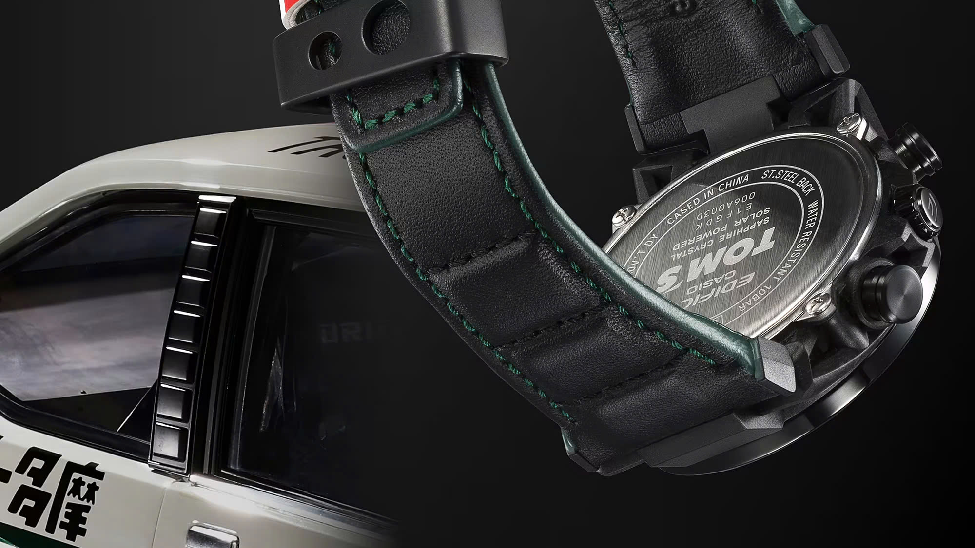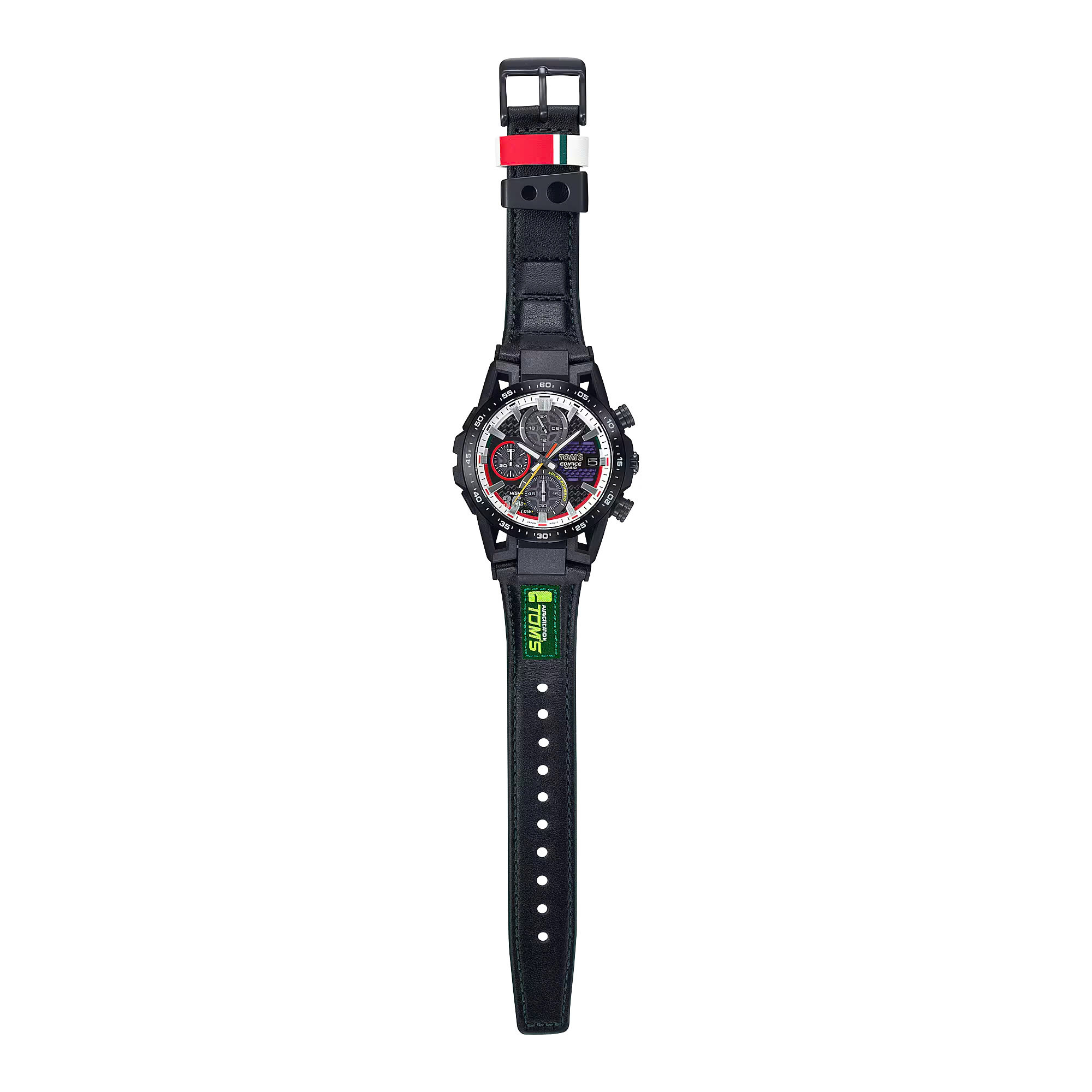 Cả logo của TOM’S và EDIFICE đều được khắc trên nắp lưng, tương tự chiếc đồng hồ bấm giờ chính thức của TOM’ S. Chiếc đồng hồ đặc biệt với các màu sắc cơ bản là trắng, đỏ và xanh lá cây — đây là những màu sắc trên thân chiếc TOM’S KP47 Starlet — đi kèm logo hiện tại và trước đây của TOM’ S.