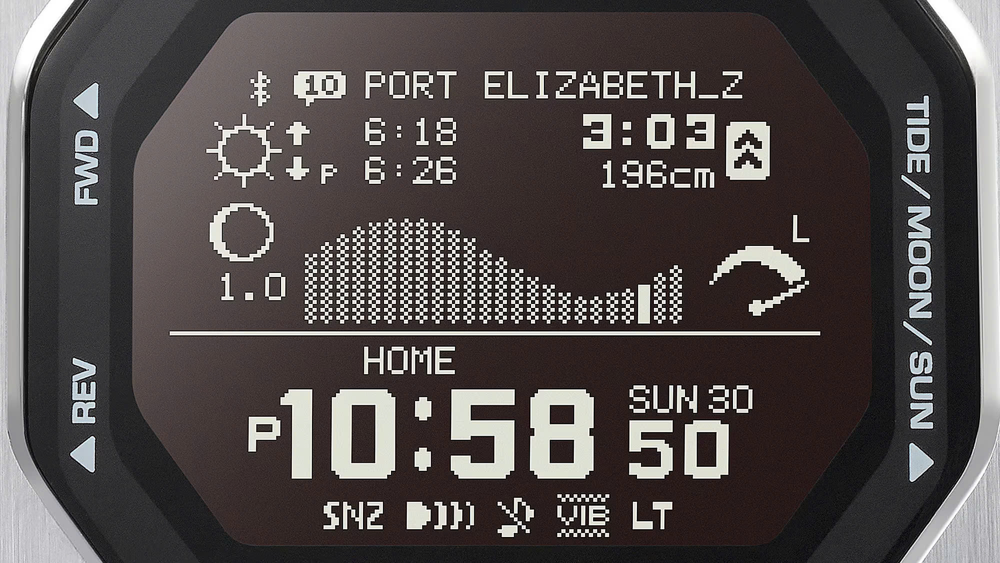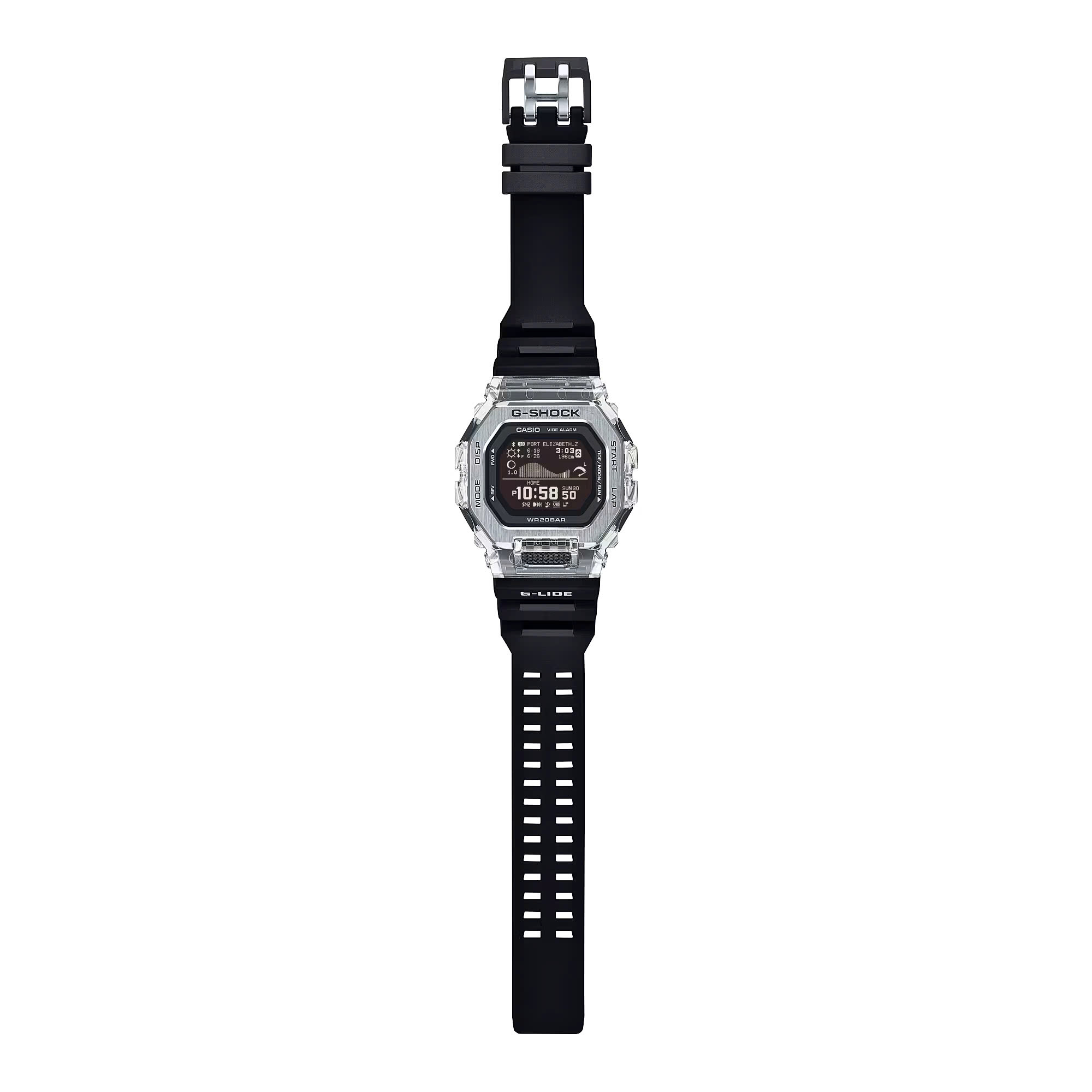 - Có được độ bền và chức năng đáp ứng phong cách lướt sóng của bạn cũng như chất liệu và màu sắc mùa hè mà bạn yêu thích trong G-SHOCK từ dòng G-LIDE. Lấy cảm hứng từ cảnh lướt sóng mùa hè, gờ được làm bằng hai vật liệu khác nhau để gợi lên hình ảnh những con sóng lấp lánh dưới ánh nắng mặt trời. Mặt trên gờ, bằng thép không gỉ với các cạnh vát được tráng gương, tương phản tinh tế với độ trong mờ của đế gờ bằng nhựa. Dây đeo được làm bằng uretan sinh học và có khe hở để vừa vặn hơn cũng như giúp thoát nước và mồ hôi. Các thành phần nhựa chính được sử dụng cho dây đeo được làm bằng nhựa sinh học, một loại vật liệu được kỳ vọng sẽ giúp nhằm làm giảm tác động đến môi trường. Tất cả những điều này mang lại cảm giác đeo thoải mái mà bạn đang tìm kiếm để bạn có thể tập trung vào việc lướt sóng. Có đầy đủ tính năng trong tầm tay với Kết nối điện thoại thông minh. Chỉ cần sử dụng ứng dụng chuyên dụng để chọn một trong khoảng 3.300 điểm lướt sóng chính trên khắp thế giới và gửi các mô hình thủy triều cùng điều kiện ánh sáng ban ngày cụ thể theo vị trí đến đồng hồ. Màn hình LCD MIP độ nét cao cũng cải thiện khả năng hiển thị và cung cấp đồ thị thủy triều và tuần trăng rõ ràng, cũng như thời gian và mực thủy triều cao/thấp và thời gian mặt trời mọc/lặn — tất cả chỉ trong nháy mắt. Chiếc đồng hồ này được chế tạo để giúp những vận động viên lướt sóng chuẩn bị cho các cuộc thi khắc nghiệt trên toàn thế giới.