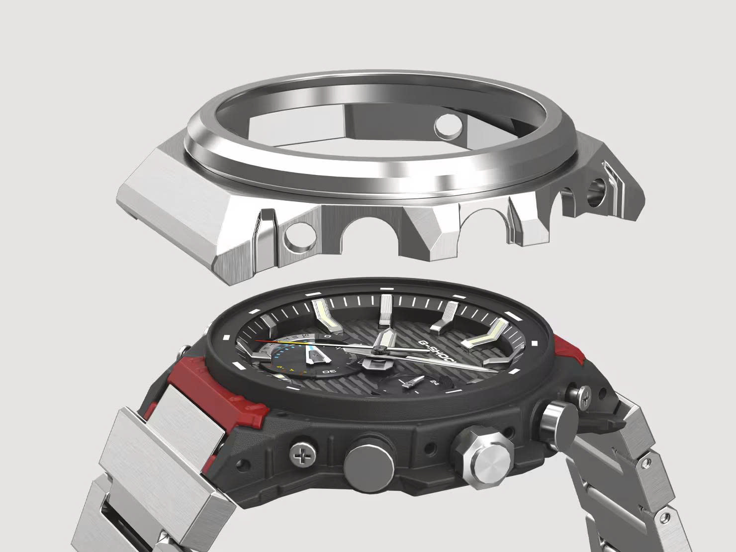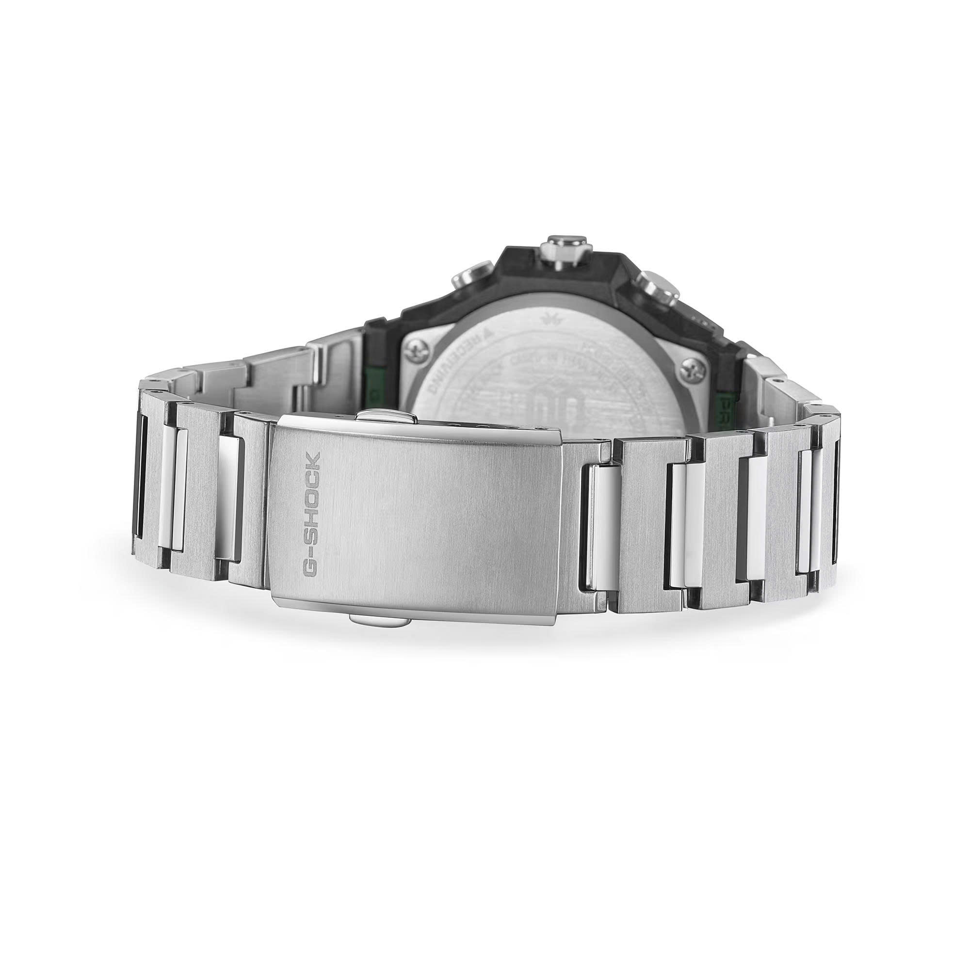 Dây đeo bằng thép không gỉ, được phát triển cho GST-B1000, được hoàn thiện với các đường vân mảnh và đánh bóng tráng gương. Móc cài gập ba mới được phát triển mang đến kiểu dáng thanh lịch và vừa vặn chắc chắn. Sự hiện diện tinh tế của móc cài làm tăng thêm vẻ ngoài tổng thể với cảm giác tinh tế nhẹ nhàng.