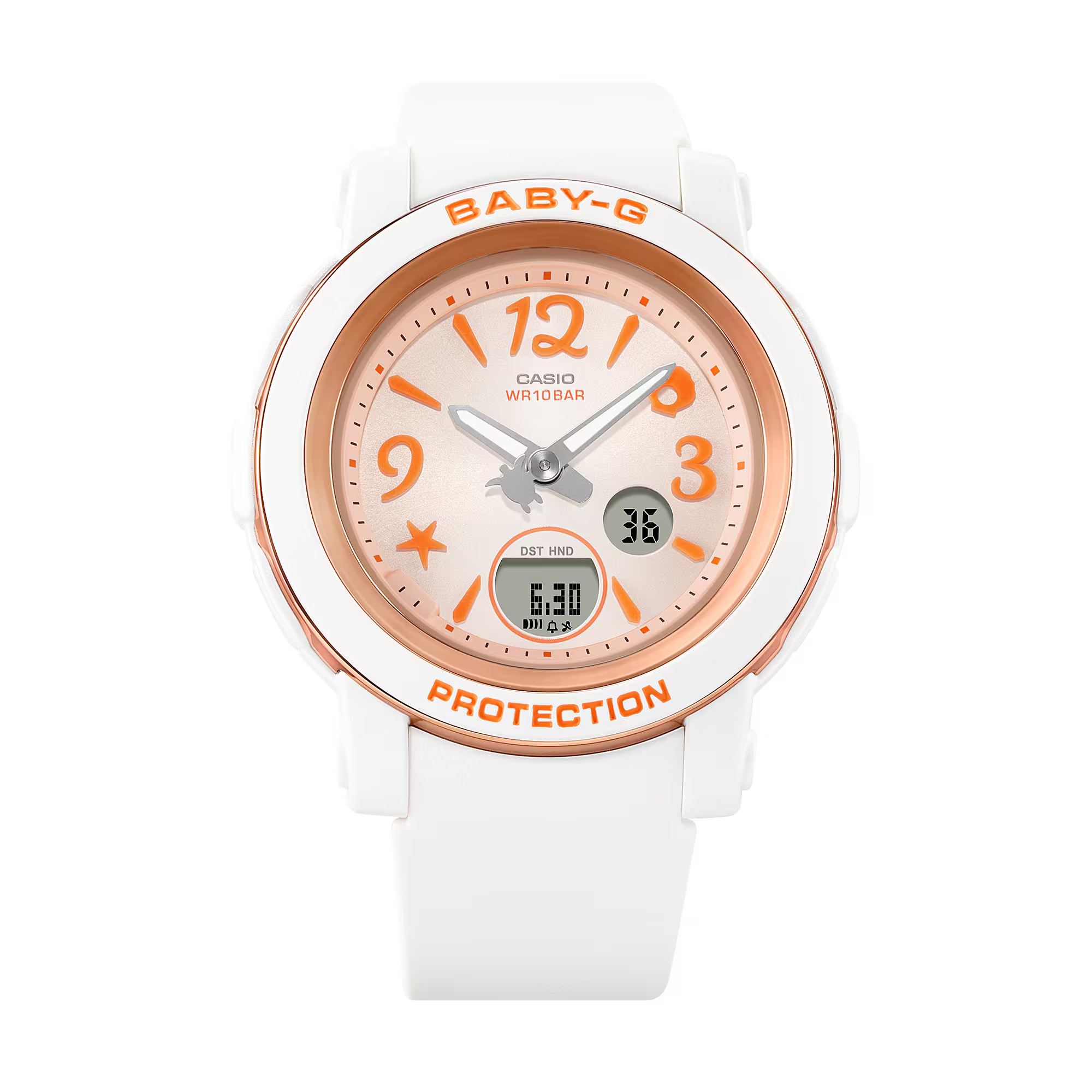 Đắm mình sâu vào thế giới dưới đáy biển với BABY-G nhiệt đới dành cho cuộc sống năng động của bạn. Sự kết hợp kim-số của BGA-290 mặt trònđược khoác lên mình màu sắc sống động gợi nhớ đến vùng biển nhiệt đới. Phương pháp lắng đọng hơi nước cùng nhóm màu được áp dụng cho đường gờ tạo thêm điểm nhấn lấp lánh cho lớp hoàn thiện mờ, mang lại phong cách bãi biển đầy màu sắc phù hợp với mọi cổ tay. Một đại dương tràn ngập sinh vật biển quét qua mặt đồng hồ. Thiết kế nổi bật của mặt số kim loại, được mô phỏng theo tia nắng xuyên qua mặt biển, có hình con rùa biển trên kim phút, một con trai ngọc ở vị trí 2 giờ và một con sao biển ở vị trí 7 giờ. Các vạch chỉ giờ silicon nổi lên với lớp phủ phát quang thậm chí còn phát sáng trong bóng tối, gợi nhớ đến biển vào ban đêm. Không chỉ sành điệu, mà còn thiết thực. Đồng hồ này không chỉ có khả năng chống va đập mà còn chống nước ở độ sâu 100 mét. Hãy làm tâm trạng của bạn tươi sáng hơn với thiết kế theo phong cách hiện đại mang đến phong cách nhiệt đới và cảm giác thư giãn tại khu nghỉ dưỡng cho những ngày hè của bạn.